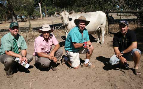 With the $8000 top price Monterey stud female, Monterey Primrose A210, is Landmark stud stock representative Nathan King (left), Elders south west sales co-ordinator Brad Preston, and loyal top price buyers Ray Palmer and Wylie Woolcock, Raymond Park Murray Grey stud, Chittering.