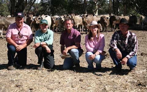 Pictured with the top selection of commercial heifers, Elders Boyanup-Bridgetown territory sales manager Bill Kessell (left), Landmark Margaret River branch manager Ken Wrigglesworth, top price buyers' representative, Ken Bland, and Scott River Trading principals Kathryn and Tony Mostert.